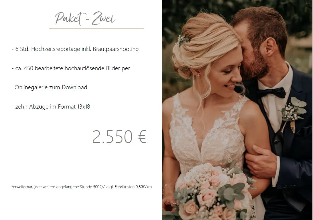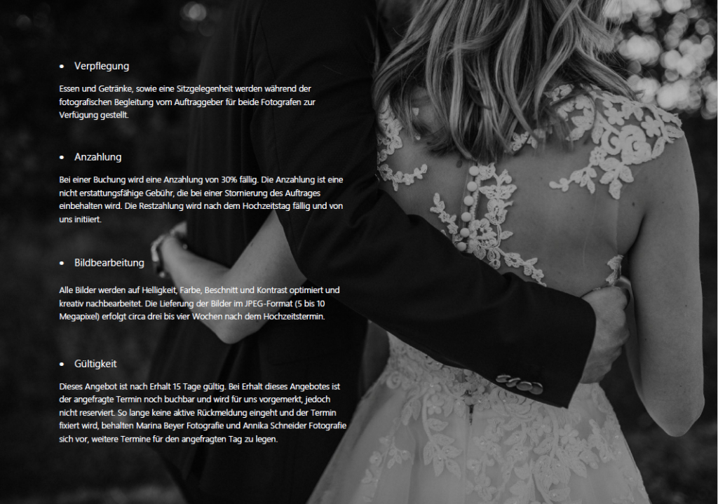 Wir beide lieben die Fotografie. In uns sprudeln Ideen für Fotos oder Licht, wir haben unterschiedliche Sichtweisen und unterschiedliche Vorstellungen. Dies führt dazu, dass wir uns gegenseitig ergänzen und unterstützen können. Einer von uns beiden kann seiner Kreativität freien Lauf geben, wobei der andere den Moment natürlich und echt festhalten wird. Ihr habt am Ende beide! Mehr Sicherheit können wir euch auch anbieten. Bei Krankheit, Versagen der Kamera, defekte Speicherkarten sind eure Erinnerungen vom Tag durch den zweiten Fotografen nicht verloren.